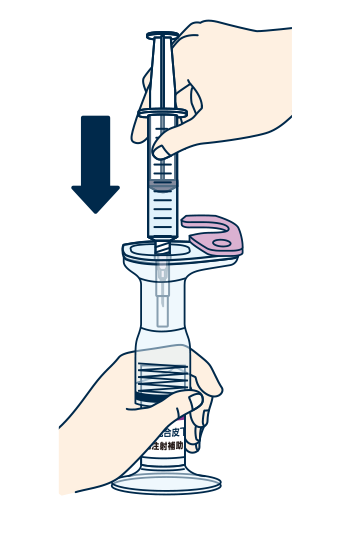 注射筒を装着する際は、自己注射補助具を机などの上に置かず、手に持って浮かせた状態で行ってください。