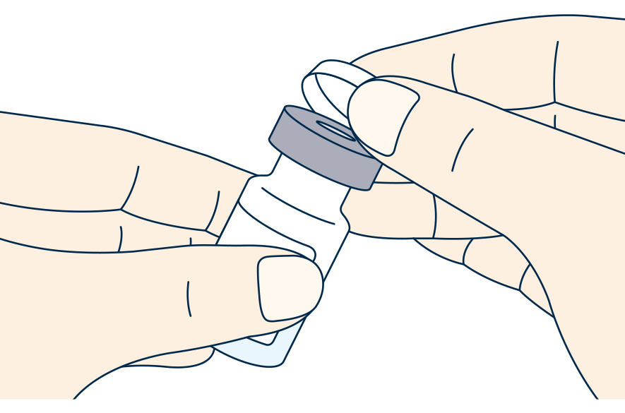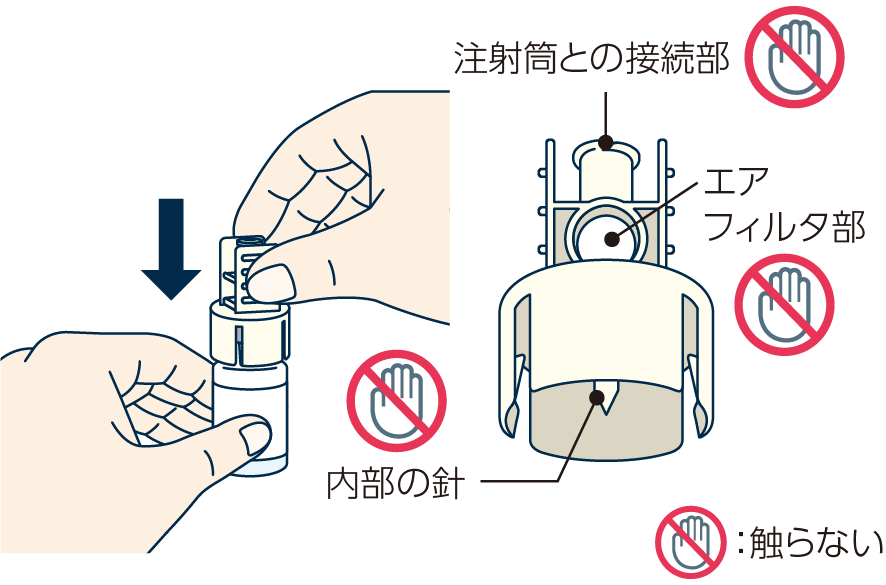 バイアルのゴム栓にまっすぐに刺してください。斜めに刺すと針で削り取られたゴム片が薬液に混入することがあります。