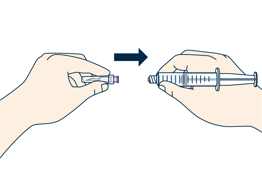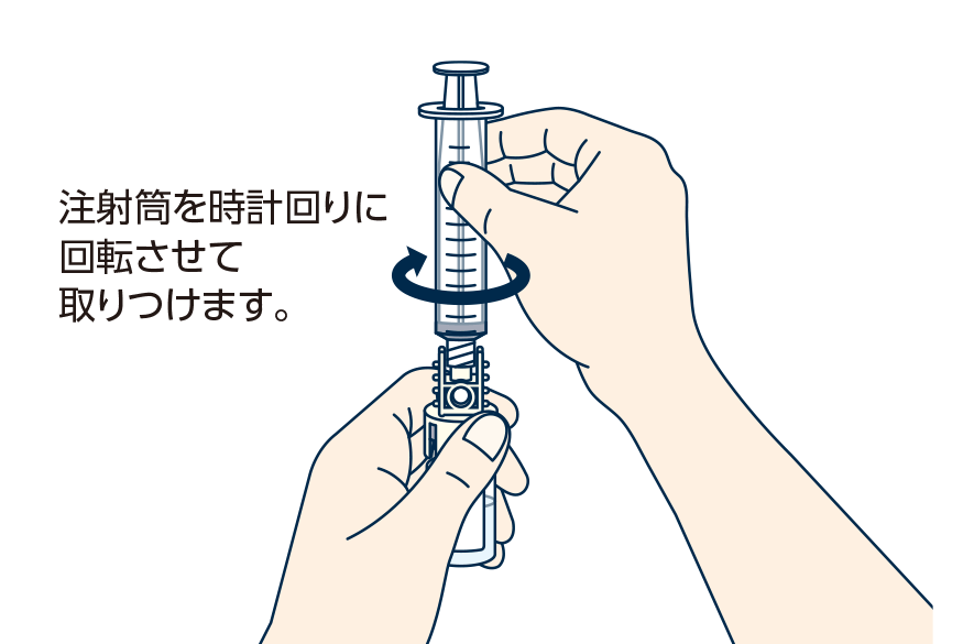③バイアルアダプタに注射筒を取りつけます(時計回り)。