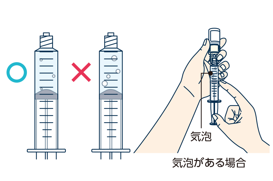 ⑤注射筒内に大きな気泡がないことを確認します(多少、小さな気泡が残っていても問題ありません)。