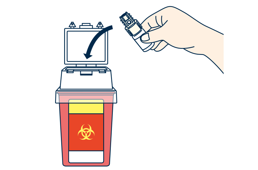 注射針、注射筒の再利用はできません。自己注射補助具から取りはずした後は、専用の廃棄ボックスなどに廃棄してください。