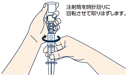⑦注射筒を下にして、バイアルアダプタから取りはずします(時計回り)。