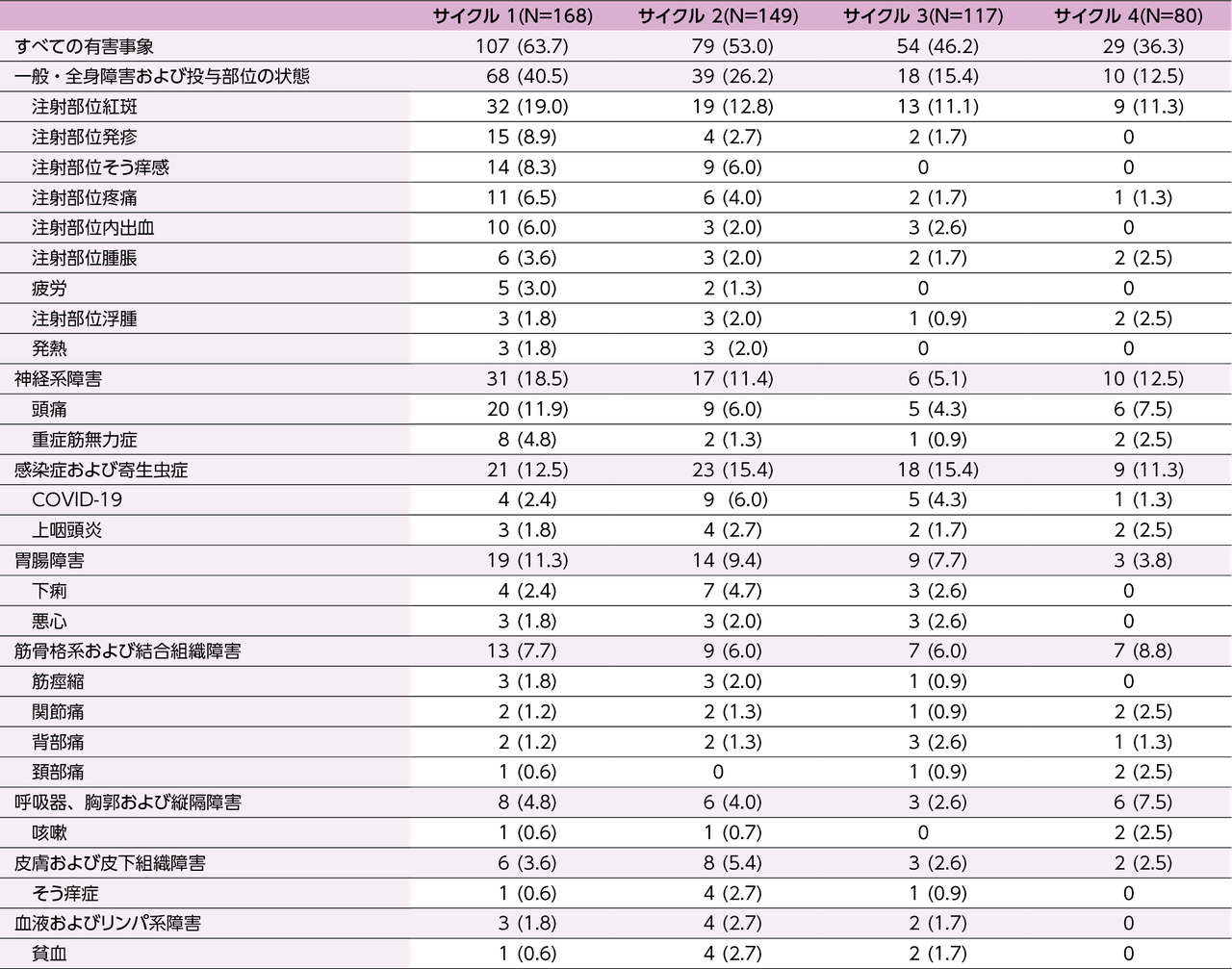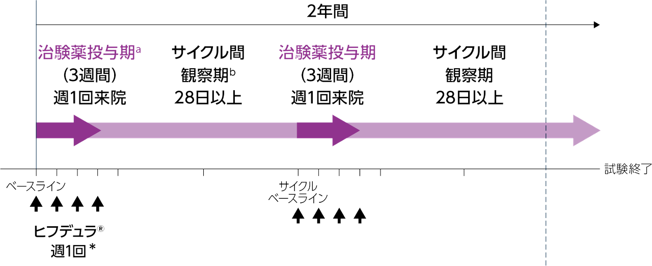 b サイクル間観察期の初回来院はヒフデュラ®の最終投与から7日後とした。その後は21日毎に来院した。サイクル間観察期は臨床反応に基づき、患者間で異なった。