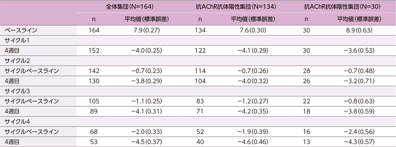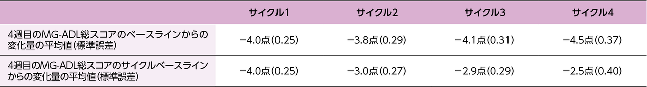 ベースラインのMG-ADL総スコアの平均値(標準誤差)は7.9点(0.27)で、4週目のMG-ADL総スコアのベースラインからの変化量の平均値(標準誤差)および4週目のMG-ADL総スコアのサイクルベースラインからの変化量の平均値(標準誤差)は下表のとおりでした。