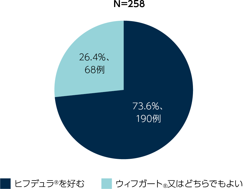 全体では、患者の73.6%がウィフガート®投与よりもヒフデュラ®投与を好みました(名目上のp値<0.0001、一般化推定方程式)。