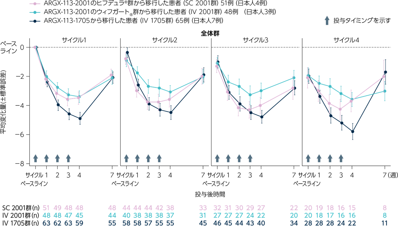 主要評価項目及び副次評価項目は、ARGX-113-2001及びARGX-113-1705の投与群別に記述統計量で要約した。