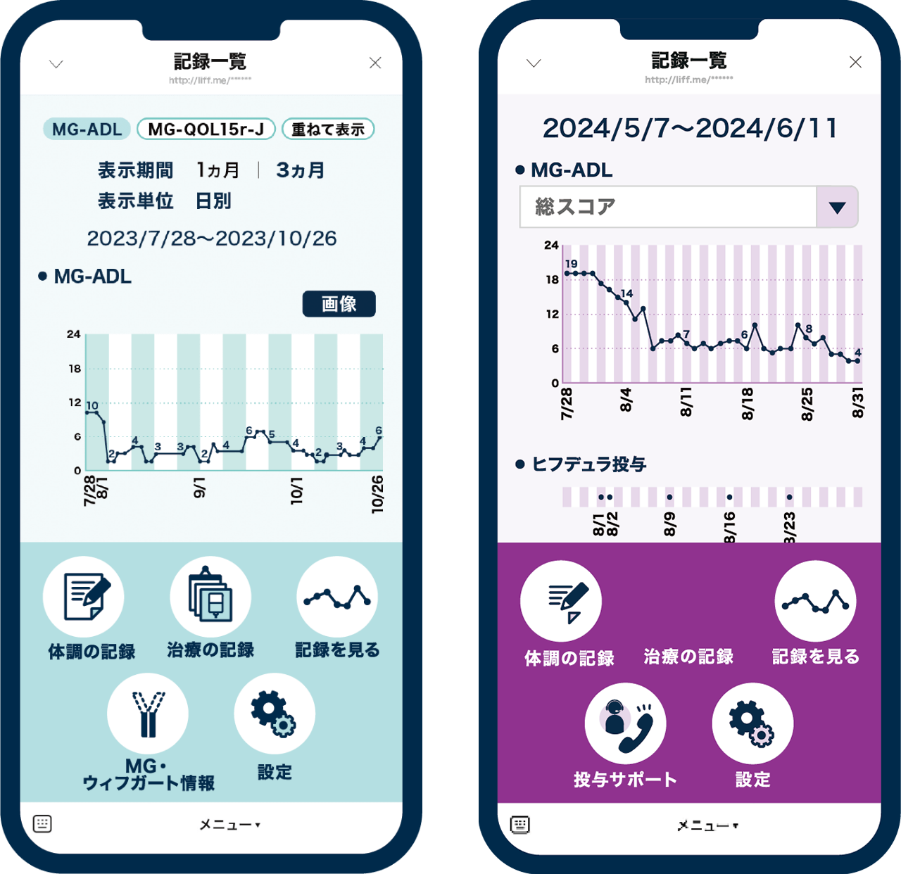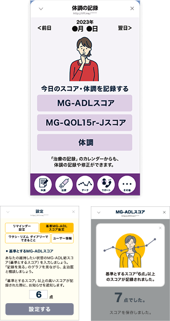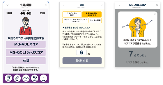 毎日の体調をMG-ADL、MG-QOL15r-J、体調5段階評価で記録できます。できるだけ1週間に1回、同じ時間帯に記録しましょう。