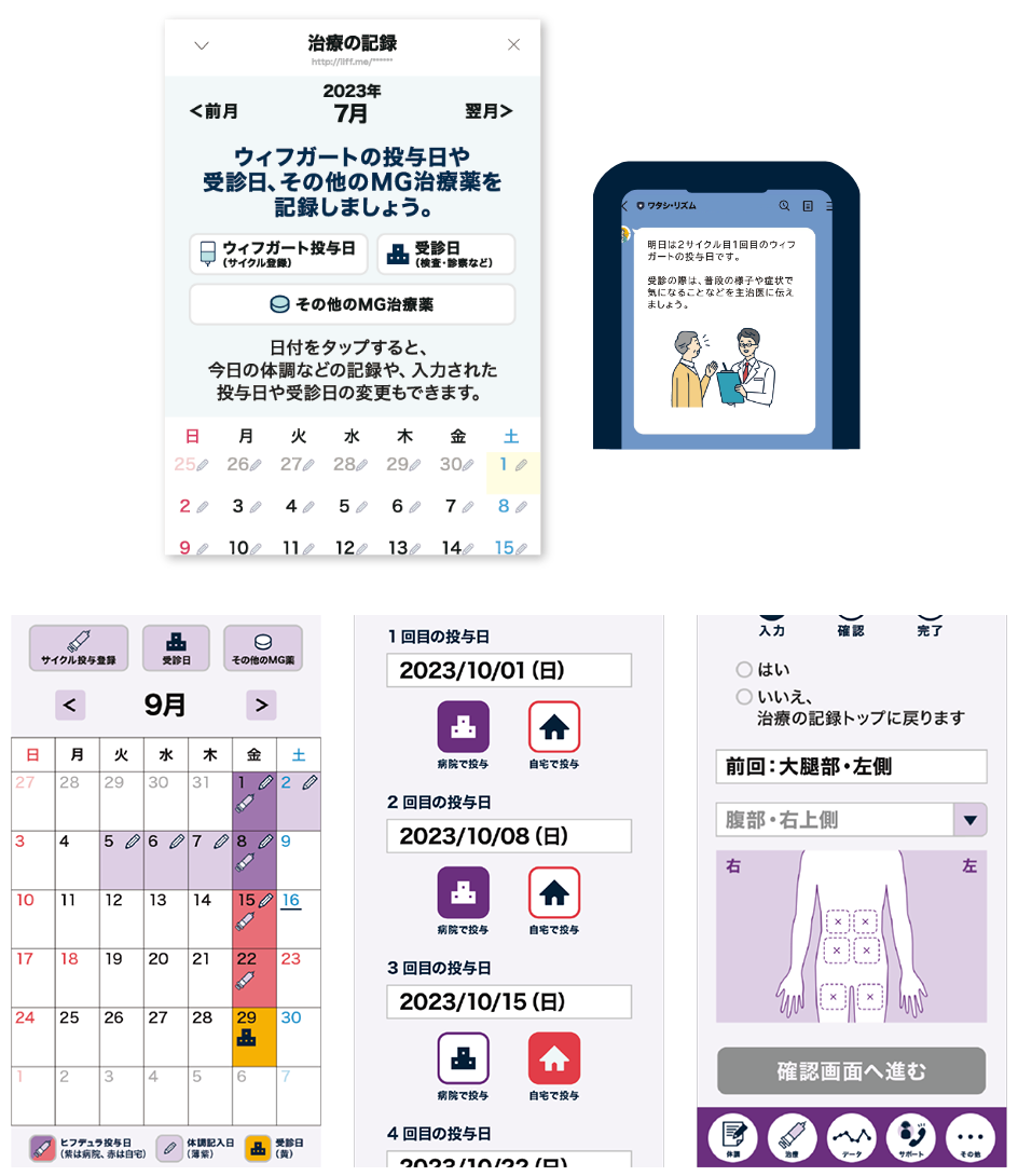 ウィフガート®またはヒフデュラ®の投与日・投与場所・投与部位や症状・体調等を記録できます。