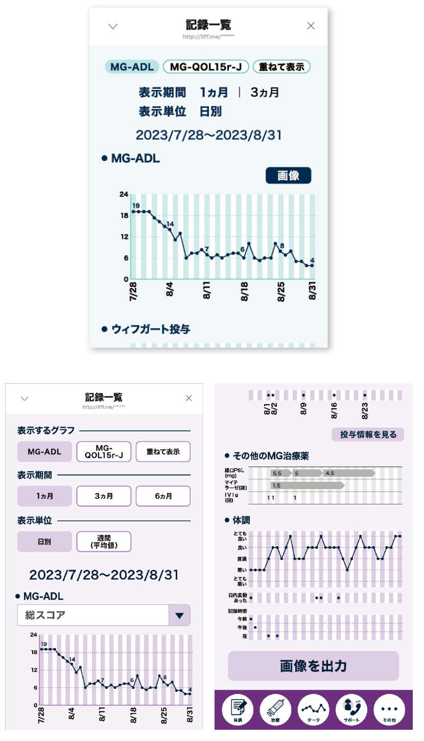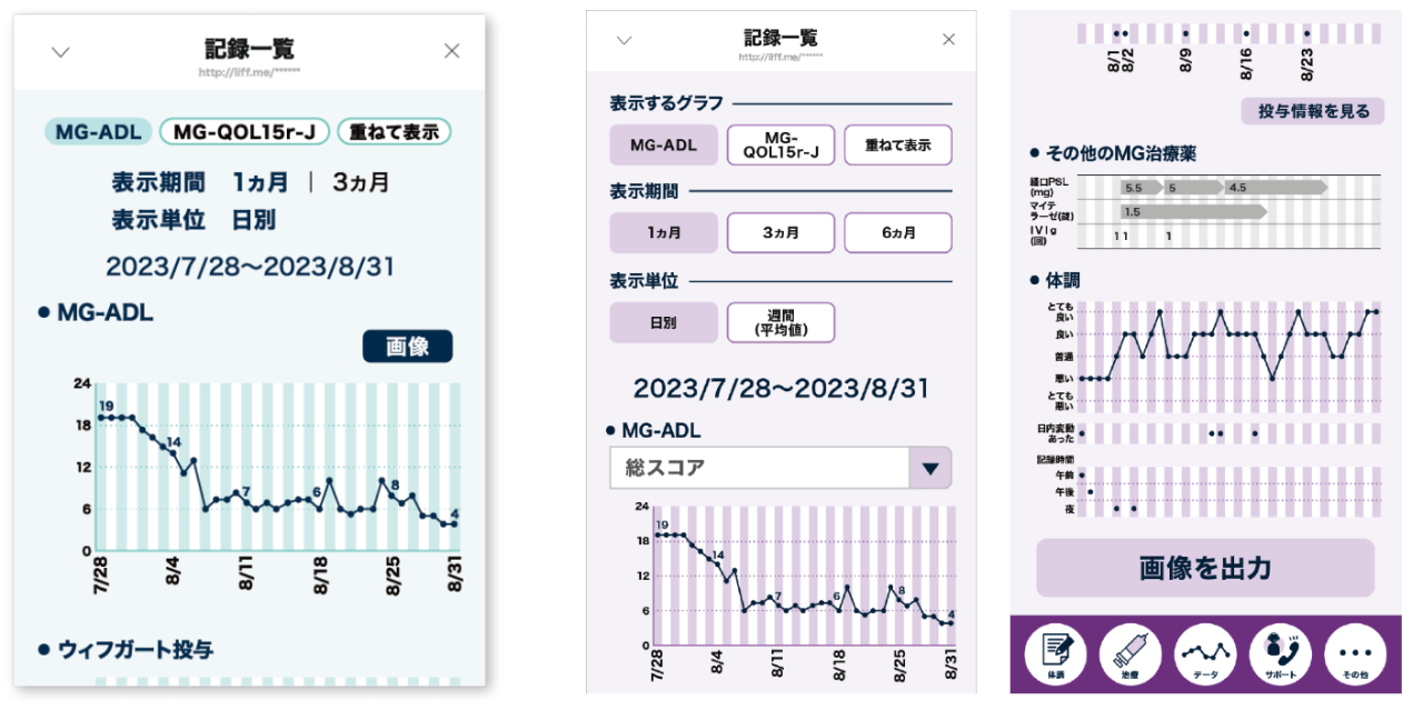 入力された体調の記録と治療の記録は、グラフ表示と画像出力ができます。
