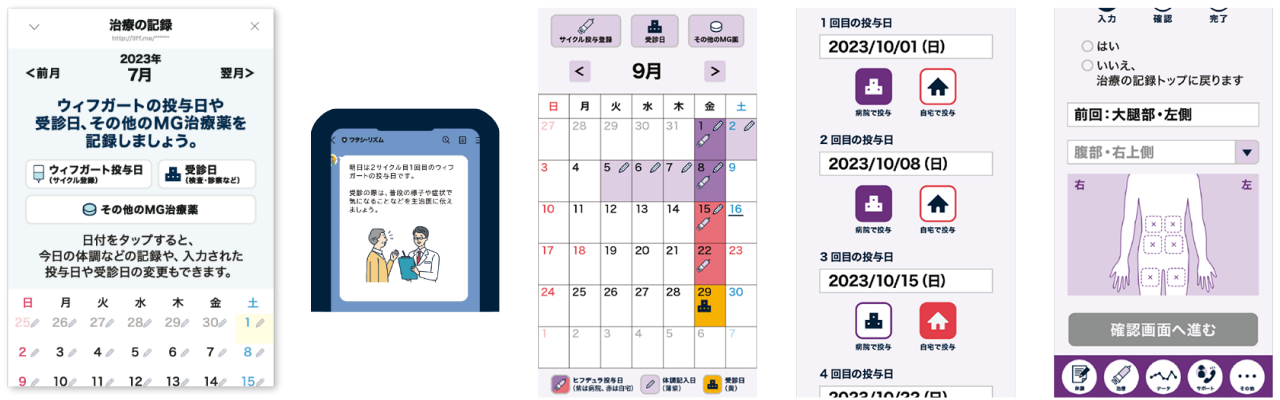 ワタシ・リズム ダイアリーは、ウィフガート®またはヒフデュラ®による治療を受ける全身型重症筋無力症の患者さんが、ご利用いただけるサポートサービスです。ウィフガート®またはヒフデュラ®の投与日・投与場所・投与部位や症状・体調等を記録できるサポートツール(LINE公式アカウント)です。記録した内容をグラフ表示することで、症状や体調の変化への気づきをサポートします。