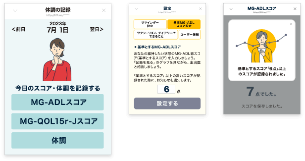 MG-ADLやMG-QOL15r-Jなどにより日々の体調を記録できます。