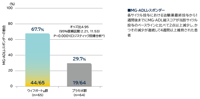MG-ADL及びQMG総スコアに関する反応パラメータの解析には、有効性の主要評価項⽬と同様のロジスティック回帰モデルを適⽤した。全体集団(抗AChR抗体陽性及び陰性患者)を対象とした解析では層別因⼦に抗AChR抗体発現状況(陽性/陰性)を追加した。
