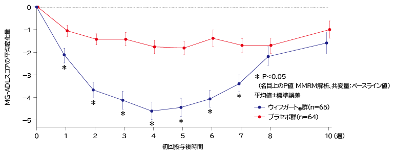 抗AChR抗体陽性患者を対象として、⼈種(⽇本⼈/外国⼈)及びベースライン治療(⾮ステロイド系免疫抑制剤※あり/なし)で層別し、ベースラインのMG-ADL総スコアを共変量とした両側正確検定(ロジスティック回帰を⽤いた)により、有意⽔準両側5%で検定した。治療効果は、オッズ⽐をその95%信頼区間とともに表⽰した。