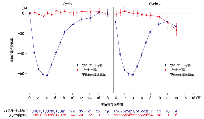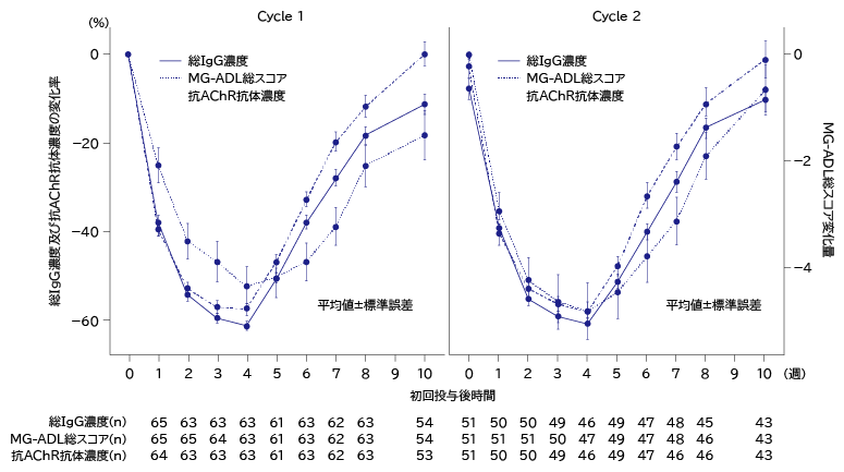 ※1: 各サイクル投与における治験薬最終投与から1週間後までにMG-ADL総スコアが当該サイクル投与のベースラインと比べて2点以上減少し、かつその減少が連続して4週間以上維持された患者