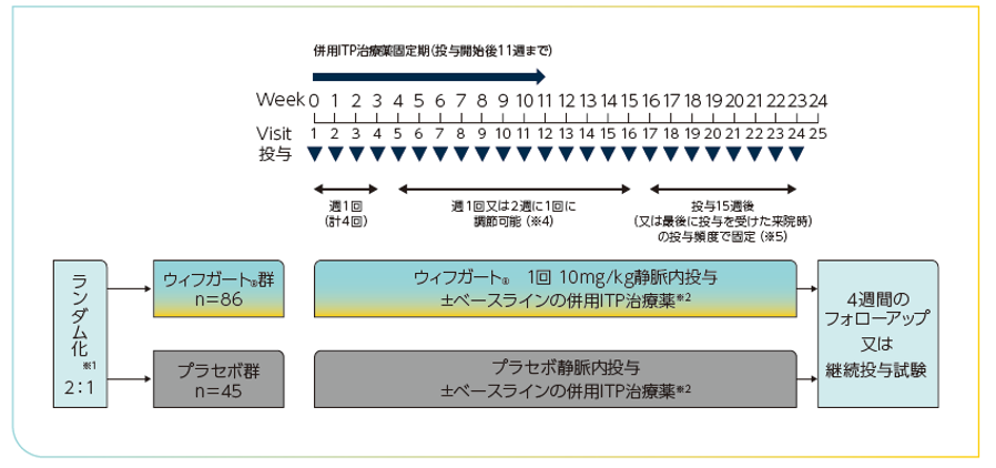 対象患者を2:1の割合でウィフガート®群又はプラセボ群に割り付けた※1。併用ITP治療薬※2及びレスキュー治療※3が許容され、試験中血小板数をモニターした。最初の3週間はウィフガート®10mg/kg又はプラセボを週1回1時間かけて静脈内投与し(計4回)、4~15週は投与頻度を週1回又は2週に1回に調節可能とした※4。16~23週は、投与15週後(又は最後に投与を受けた来院時)の投与頻度で固定した※5。23週の治験薬投与後、1週間の投与終了期間を経て、第Ⅲ相継続投与試験(ARGX-113-1803試験)に移行した。