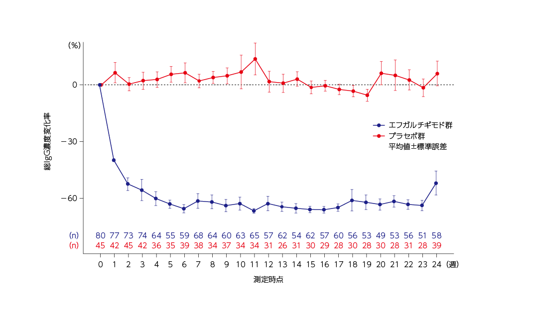 総IgG濃度は、ウィフガート®の週1回投与開始後の最初の4週間を通して減少し、4週にはほぼ最大の減少に達しました。その後、総IgG濃度のベースラインからの平均減少率は、24週の治療薬投与期間を通して60%程度を維持しました。