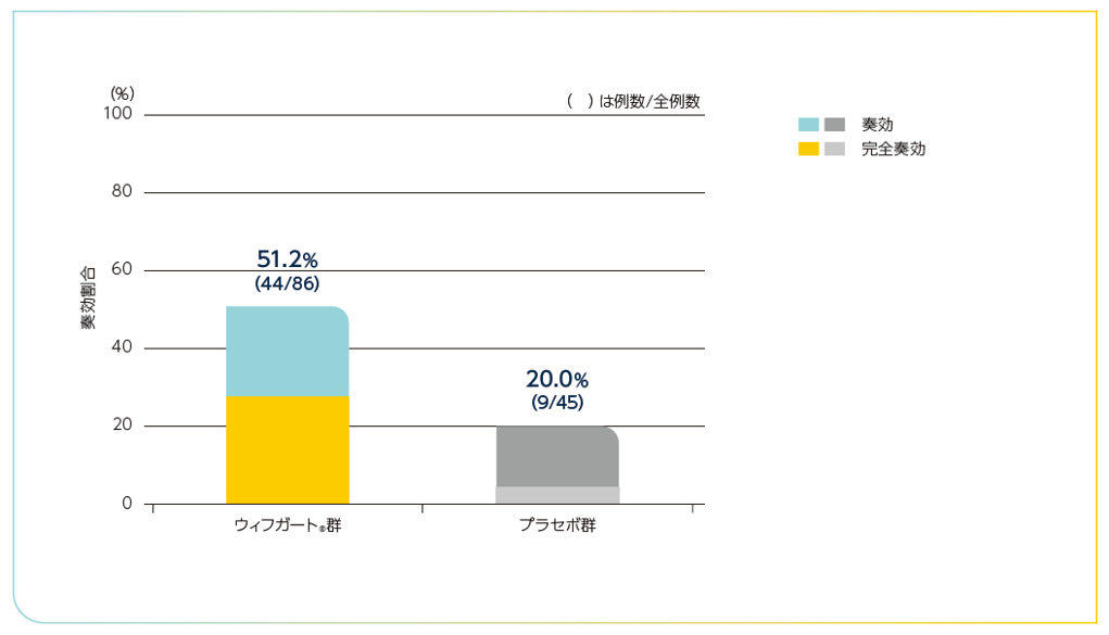 ウィフガート®群がプラセボ群と比較して統計学的に有意に高く、ウィフガート®群が86例中22例(25.6%)、プラセボ群が45例中3例(6.7%)でした(P=0.0108、Cochran-Mantel-Haenszel検定※2:両側P値)。