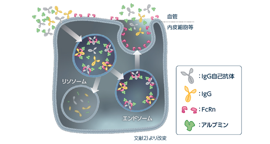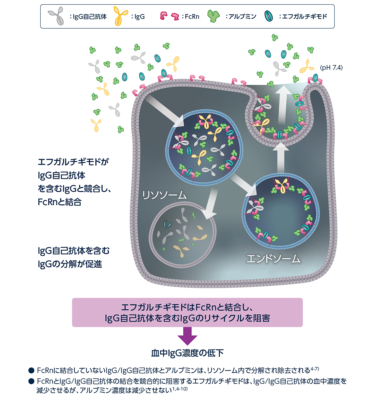 FcRnは主として細胞内に局在し、細胞内に取り込まれたIgG自己抗体を含むIgGとエンドソーム内(酸性条件下)で結合して、IgG自己抗体を含むIgGがリソソームに輸送されて分解されるのを抑制し、細胞外に再度放出(リサイクル)します。FcRnは、この機序によりIgG自己抗体を含むIgGの血中濃度を維持します1,2,3)。