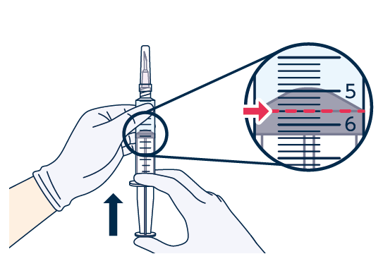 ③注射筒内に異物がないことを確認後、注射針の結合部を注射筒の先端に取りつけます。ゆっくりとプランジャーを押して、気泡を注射針の針先から押し出し、針の先端まで薬液を移動させます。次に、5.6mLに一致するまでプランジャーを押し進めます。