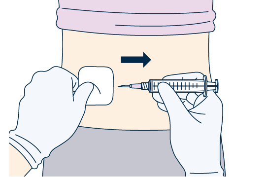 ④注射部位(腹部又は大腿部)の皮膚を優しくつまみ、皮膚の「テント」を作ります。皮膚の「テント」の真ん中に針穴を上にして針を45度~90度の角度で優しく刺します。