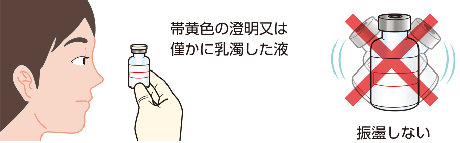 ①バイアル内の薬液を、バイアルアダプタ又は注射針を用いて注射筒に6.0mL程度移します。(薬液吸引前の空気の注入は不要です。)