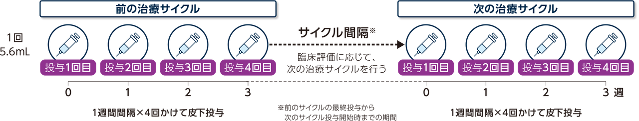 通常、成人には本剤1回5.6mL(エフガルチギモド アルファ(遺伝子組換え)として1,008mg及びボルヒアルロニダーゼ アルファ(遺伝子組換え)として11,200単位)を1週間間隔で4回皮下投与する。これを1サイクルとして、投与を繰り返す。