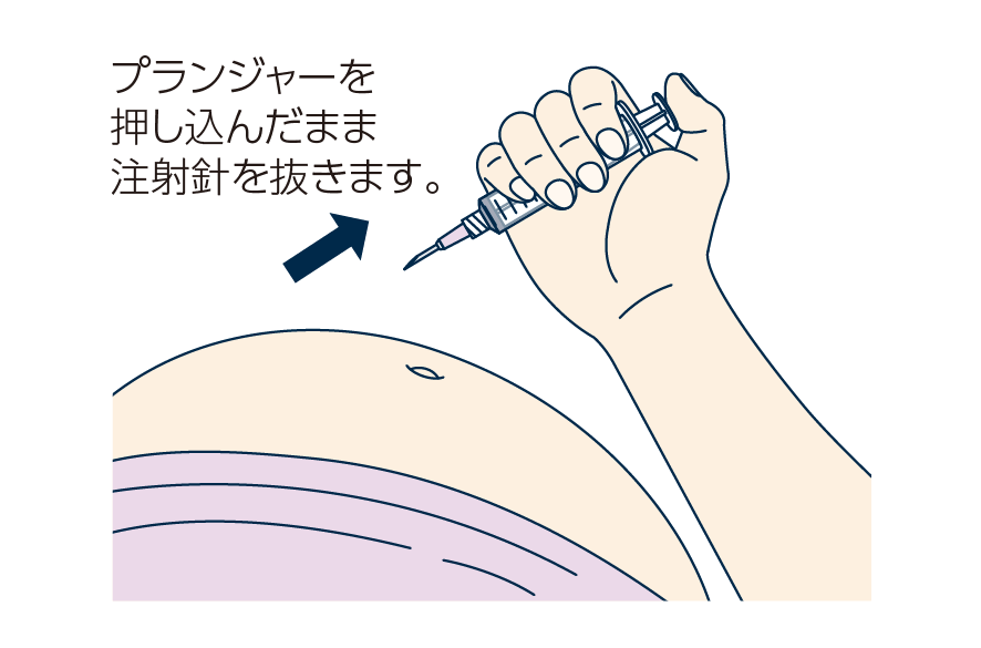⑥薬液を全量注入したことを確認した後に、皮膚をつまんでいた手をはなし、注射針を刺した角度と同じ角度で抜きます。