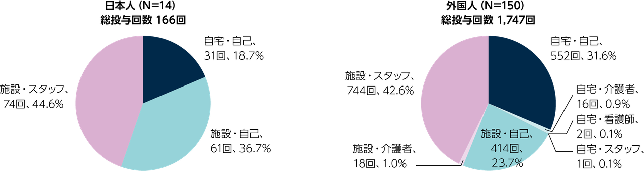 外国人患者集団:治験実施施設のスタッフによる投与42.6%、在宅での自己投与31.6%、治験実施施設での自己投与23.7%、治験実施施設での介護者支援投与1.0%、在宅での介護者支援投与0.9%、在宅での訪問看護師による投与0.1%、在宅での治験実施施設のスタッフによる投与0.1%
