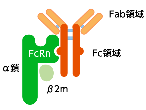 FcRnは、MHCクラスI分子に類似した構造を持ち、α鎖とβ鎖(β2m※)の2つのポリペプチド鎖からなるヘテロ二量体を形成する 受容体です。