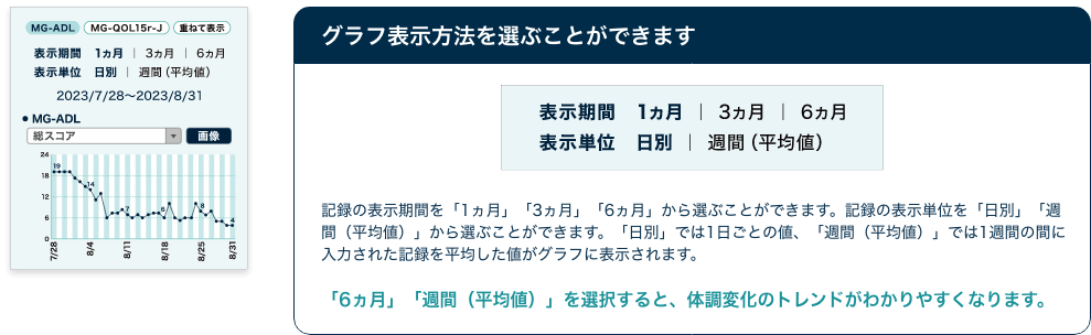 MG-ADLやMG-QOL15r-Jなどにより日々の体調を記録できます。