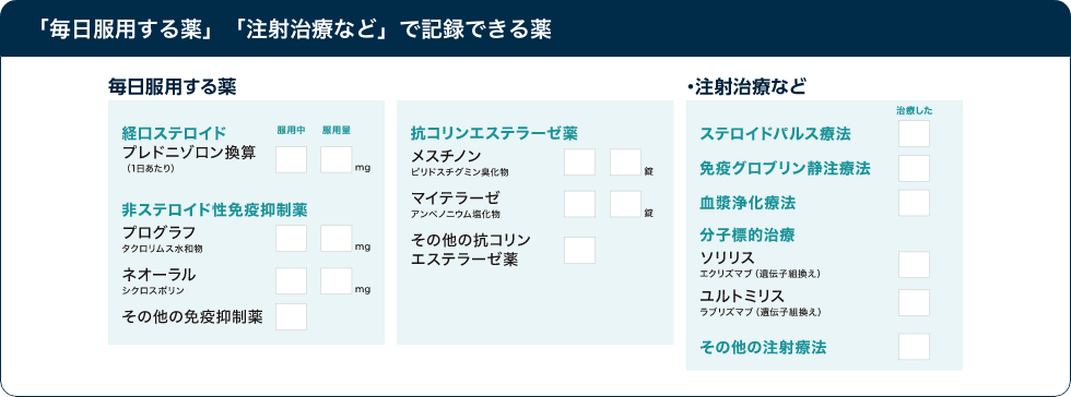ウィフガートやヒフデュラに併用するMG治療も記録できます。