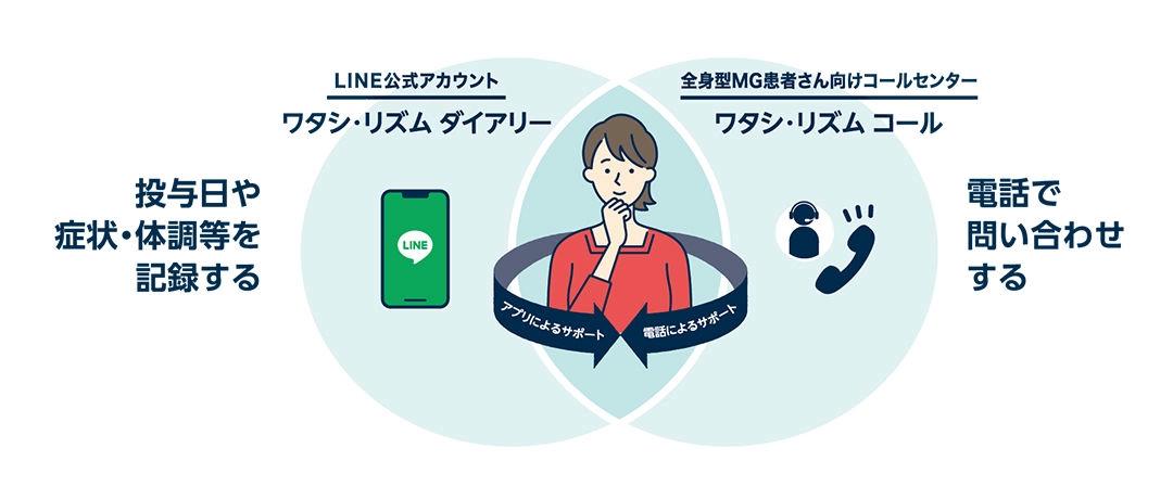 ウィフガート®またはヒフデュラ®で治療中の全身型MG患者さんからの電話によるお問い合わせにお答えするサービスです。