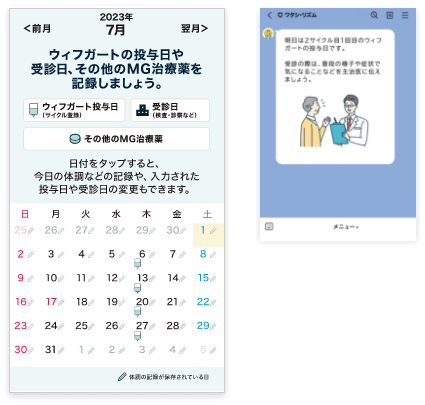 ウィフガート、ヒフデュラの投与日、その他のMG治療薬、受診日等を記録できます。
