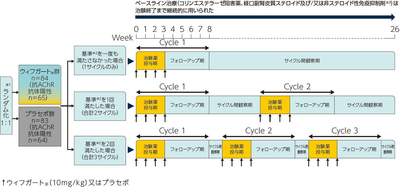 ※1: 各サイクル投与における治験薬最終投与から1週間後までにMG-ADL総スコアが当該サイクル投与のベースラインと比べて2点以上減少し、かつその減少が連続して4週間以上維持された患者