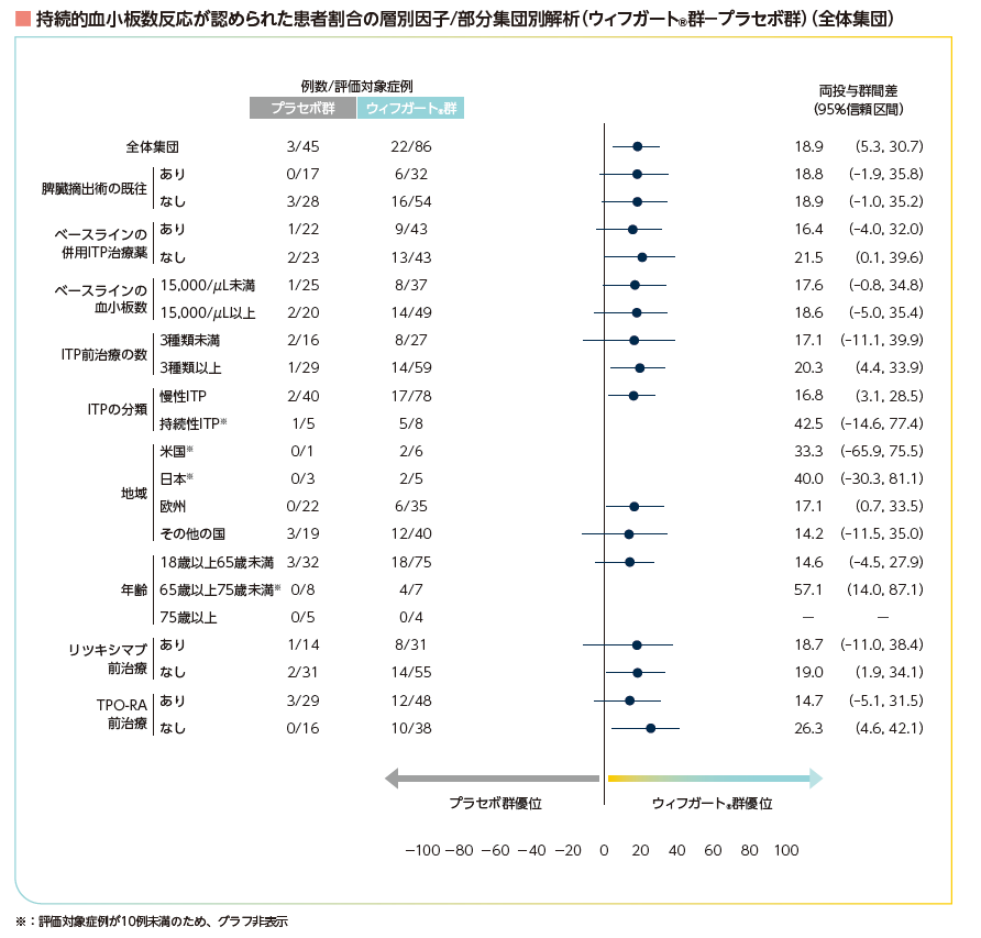 持続的血小板数反応(19~24週)が認められた患者の割合を、ランダム化の層別因子及び全体集団、ベースラインの血小板数、ITP前治療の数(種類)、診断からの期間、地域、年齢カテゴリー、リツキシマブ前治療及びTPO-RA前治療別に集計した。