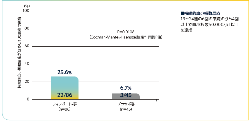 Cochran-Mantel-Haenszel検定を用いて、ランダム化の層別因子(脾臓摘出術の既往及びベースラインの併用ITP治療薬)並びにベースラインの血小板数カテゴリー(15,000/μL未満 vs 15,000/μL以上)で層別解析を行った。