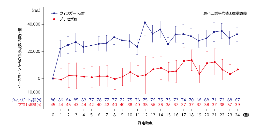 MMRMに基づく血小板数の1週でのベースラインからの変化量の最小二乗平均値(標準誤差)は、ウィフガート®群が22,151(6,127)/μLに対して、プラセボ群は−894(8,494)/μLでした。